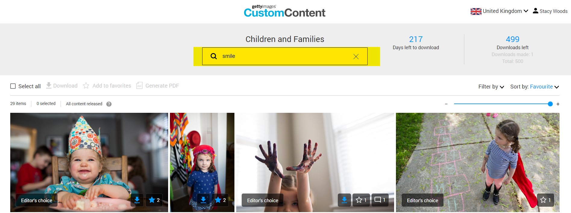 在简要中的搜索可用于资产细节页面中包含的可见元数据,如位置或描述文本。 例如,如果你想在描述中看到所有包含smile的内容, 输入搜索栏以查看结果。